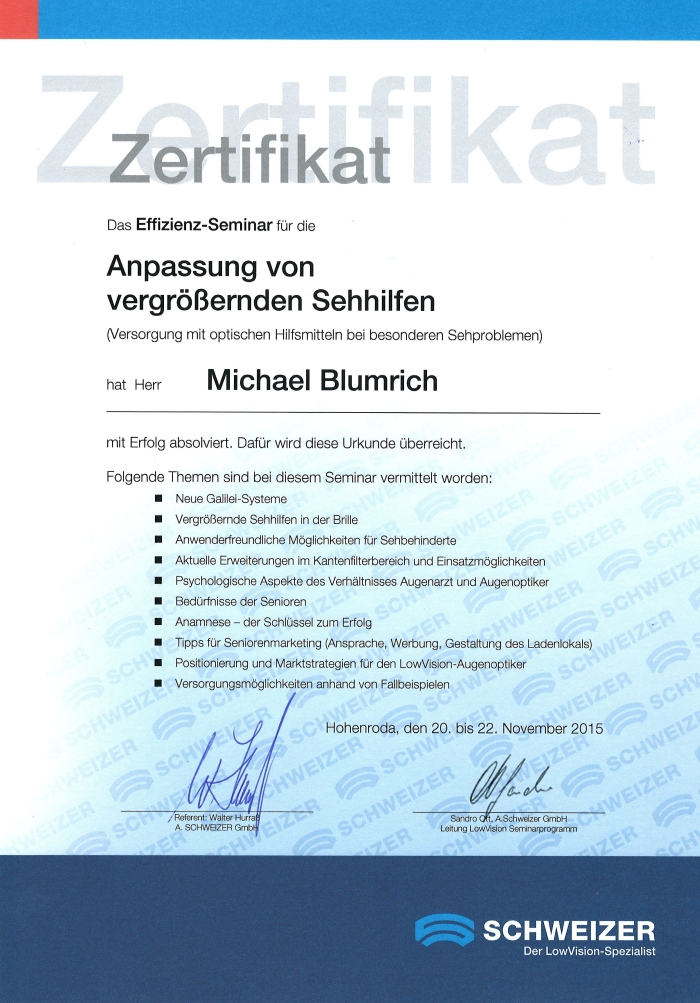 Anerkannter Fachberater für vergrößernde Sehhilfen